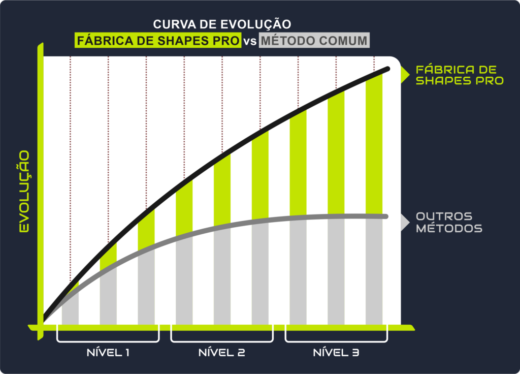 No início, a evolução é rápida, mas nos níveis intermediário e avançado, tudo desacelera. No Fábrica de Shapes Pro, isso não acontece.